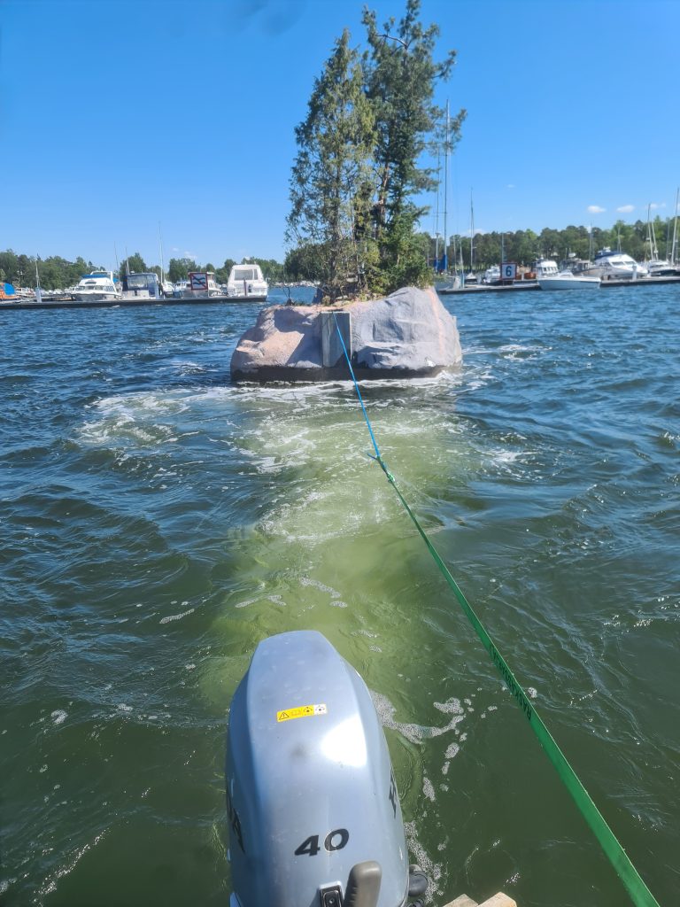 Teimme ponttoniperustuksen ja asensimme Raimo Saarisen Kelluva Saari taideprojektin Raumalla. Ponttonin päälle taiteilija teki kalliota jäljittelevän ulkokuoren.