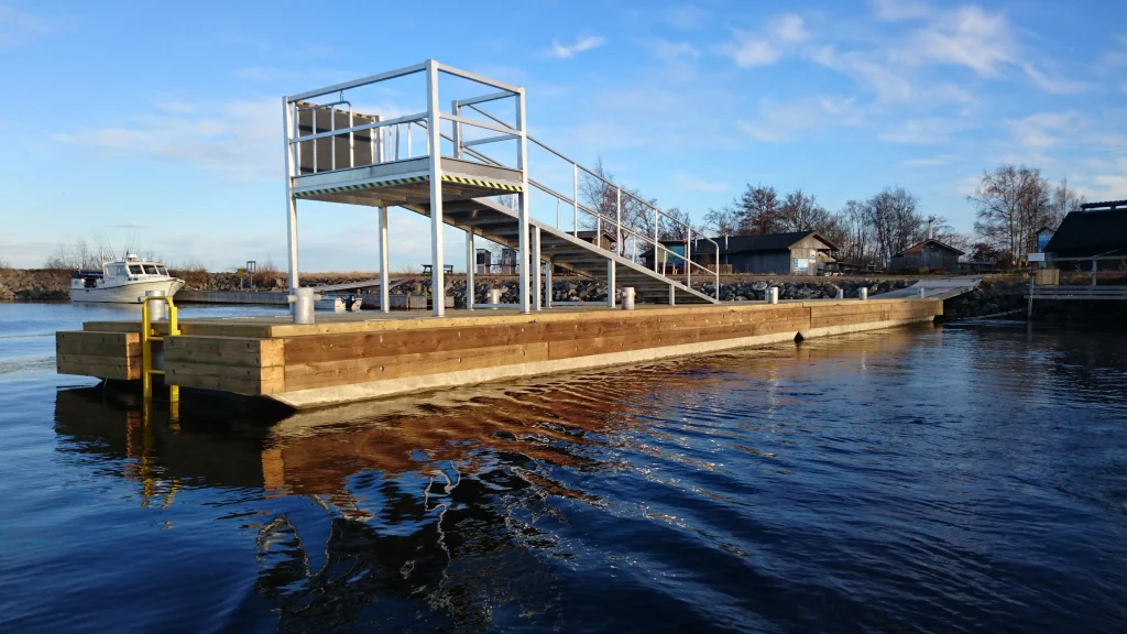 Ruokolahdelle suunnittelimme, valmistimme ja asensimme venesataman, jossa siivekkeellinen aallonvaimennin suojaa satama-allasta aalloilta. Aallonvaimenninponttonien korkeus on 1,6 m ja ponttonien pohjassa on siivekkeet, jotka auttavat aallonvaimennuksessa ponttonin leveyden, korkeuden ja massan kanssa.