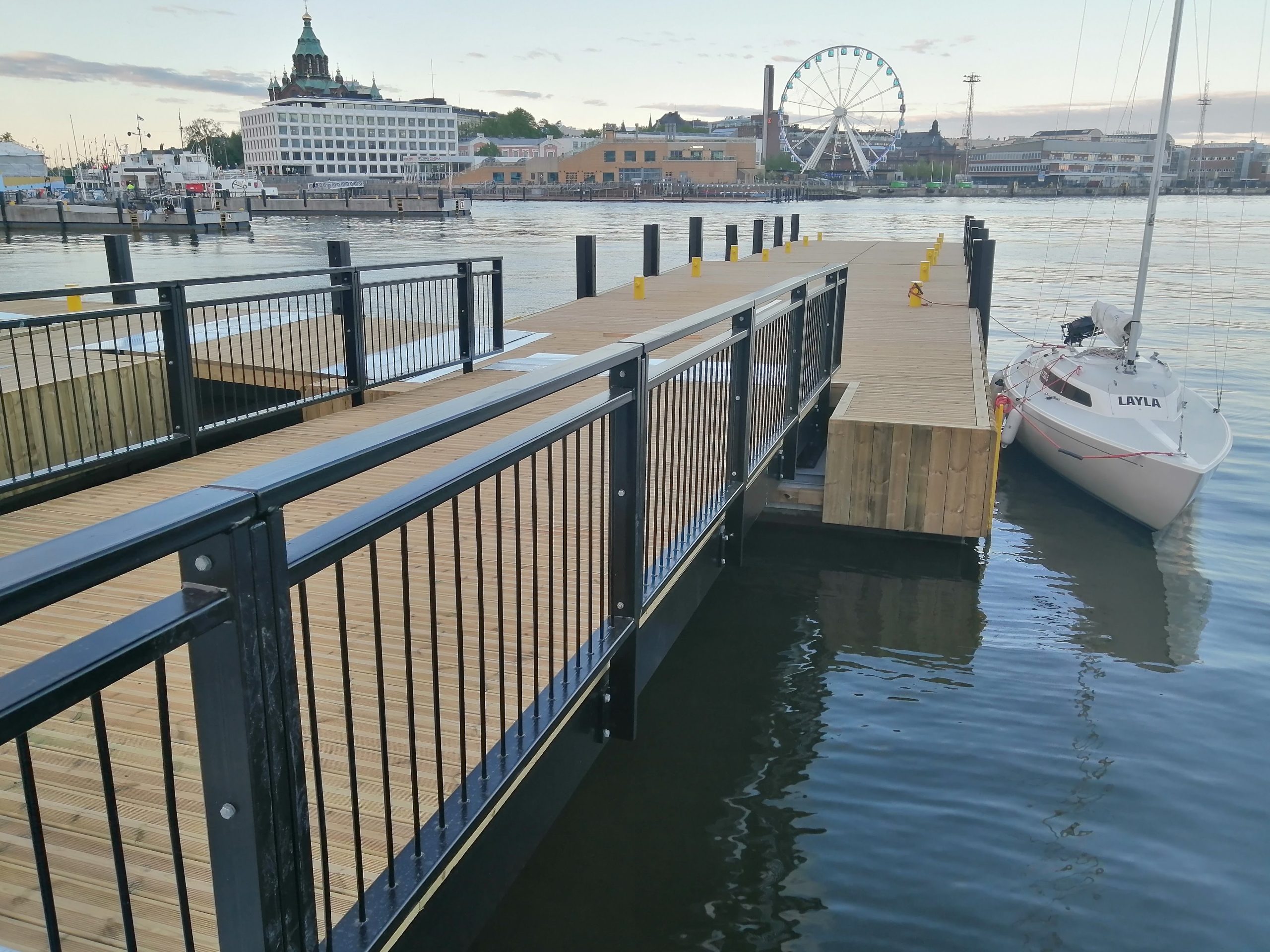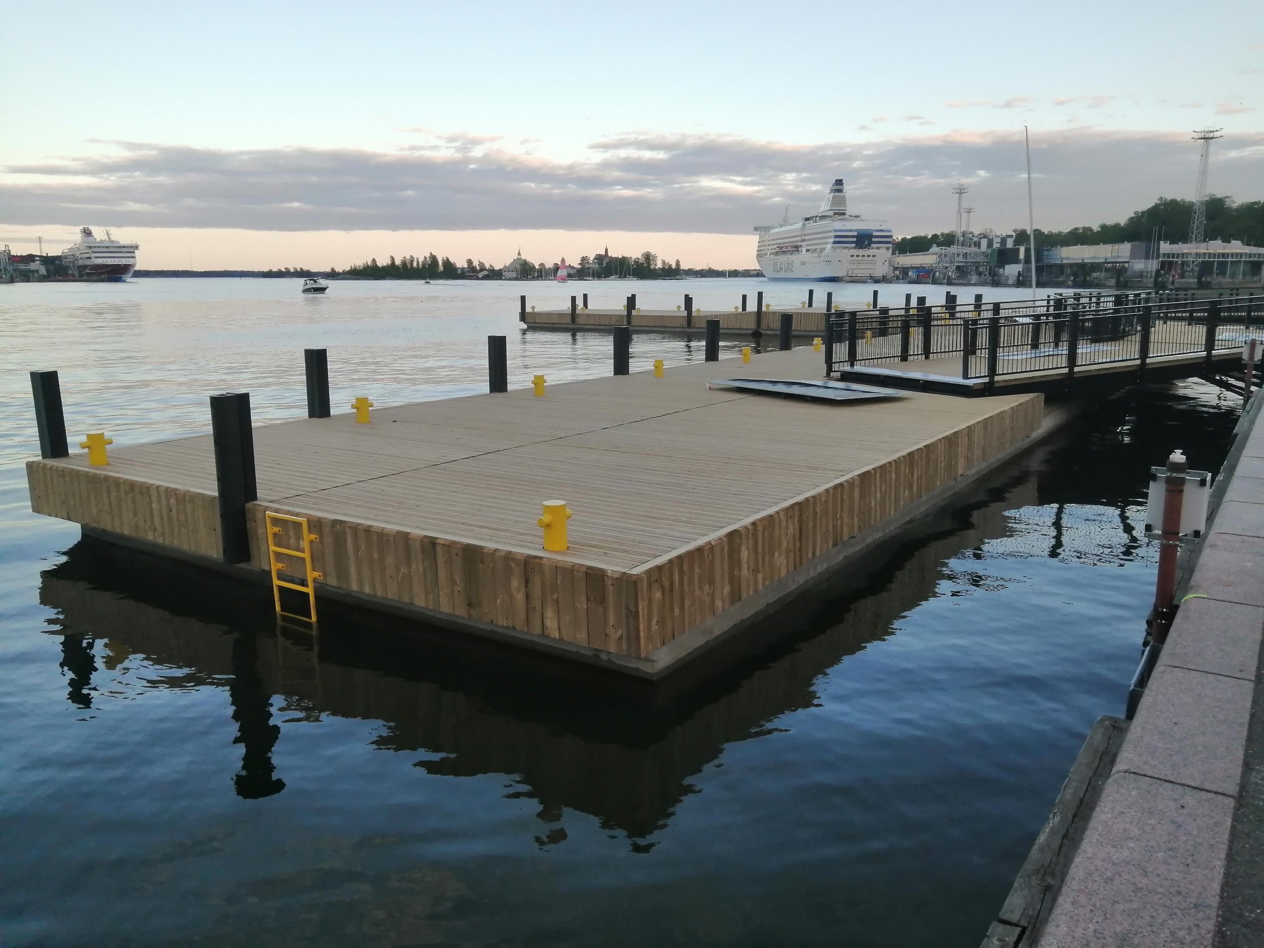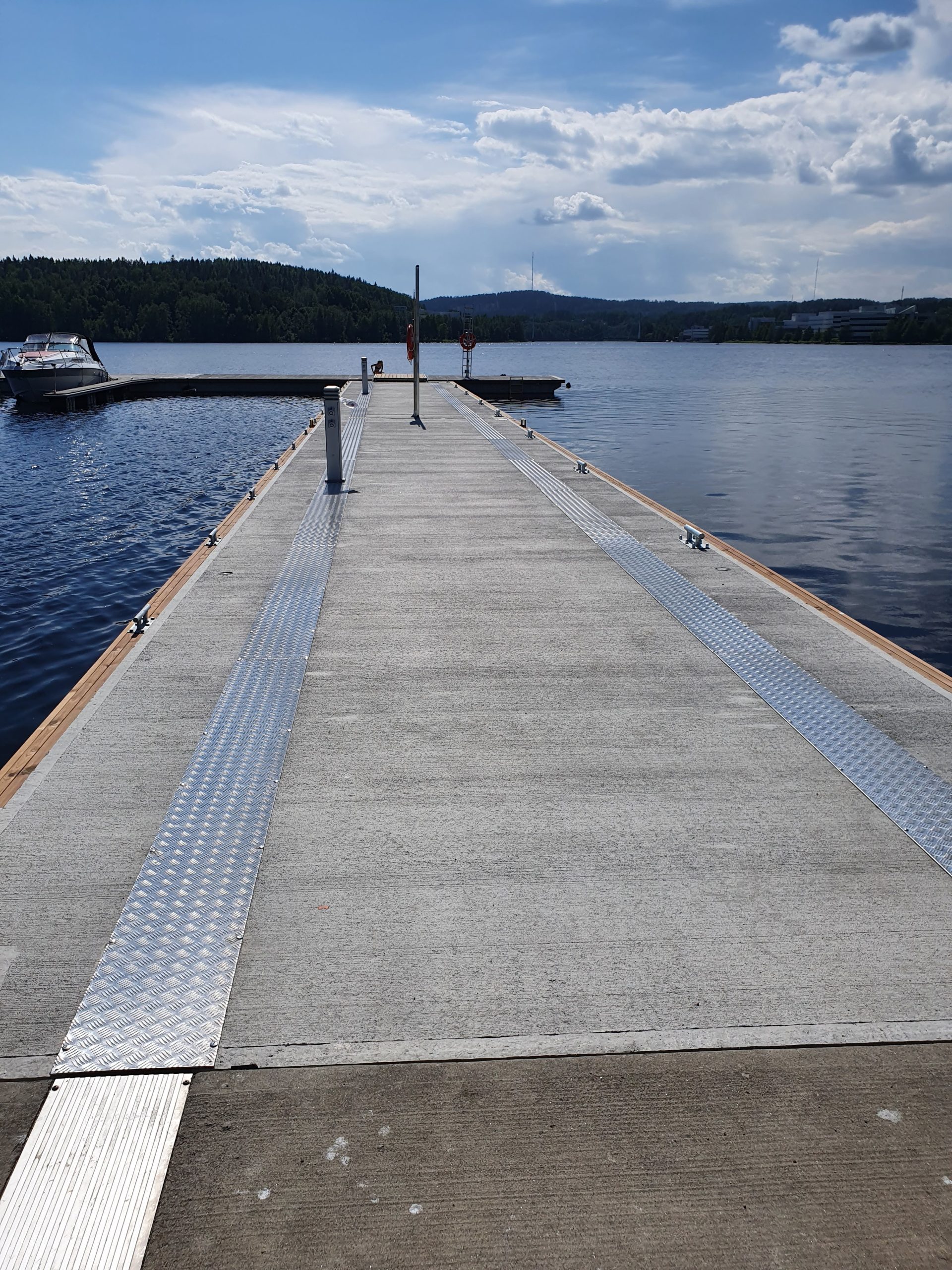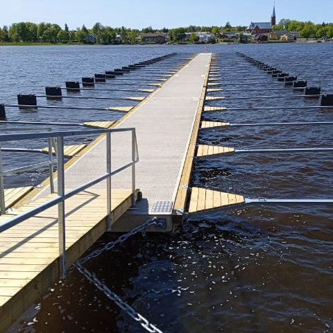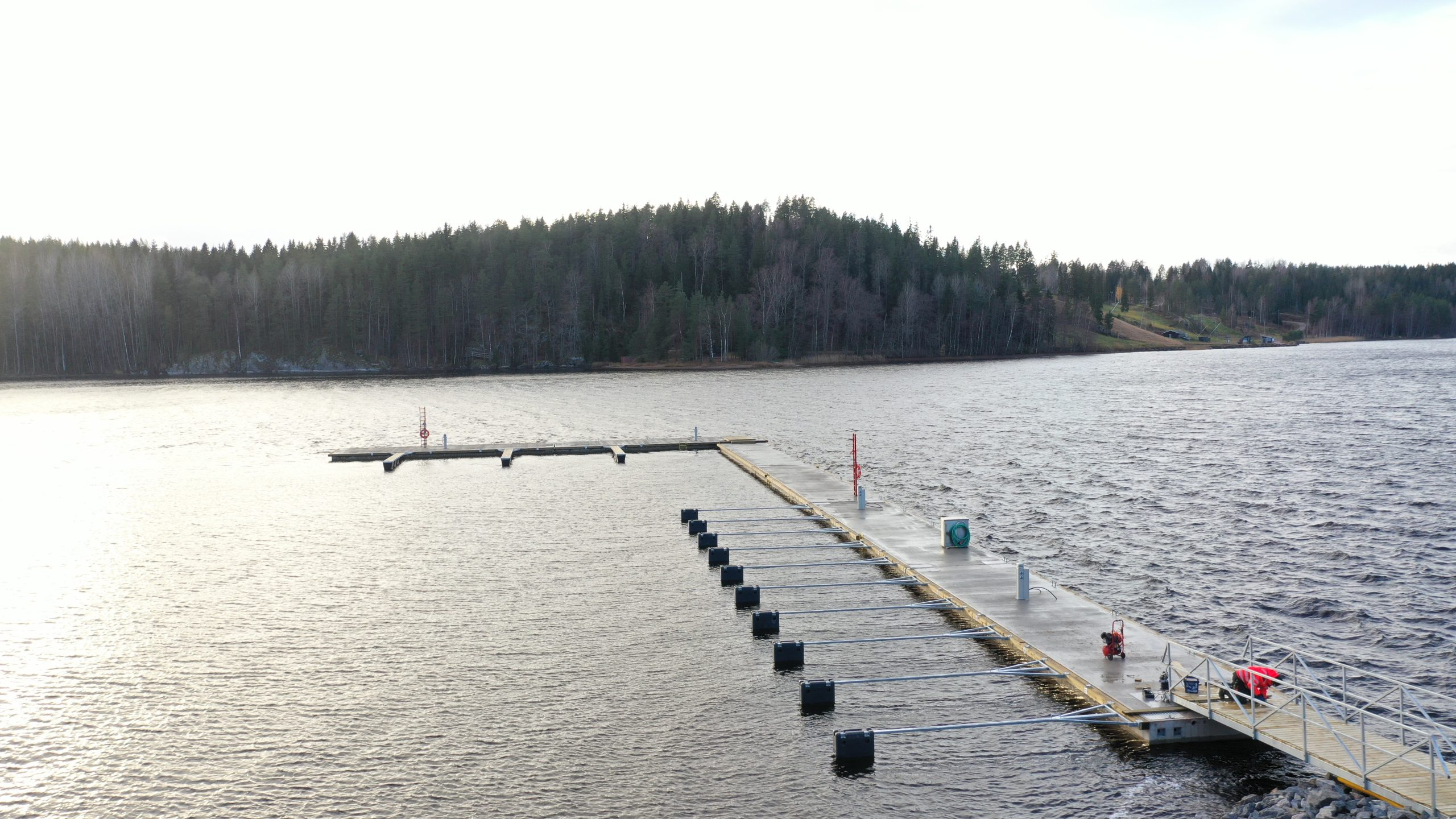 Ruokolahdelle suunnittelimme, valmistimme ja asensimme venesataman, jossa siivekkeellinen aallonvaimennin suojaa satama-allasta aalloilta. Aallonvaimenninponttonien korkeus on 1,6 m ja ponttonien pohjassa on siivekkeet, jotka auttavat aallonvaimennuksessa ponttonin leveyden, korkeuden ja massan kanssa.