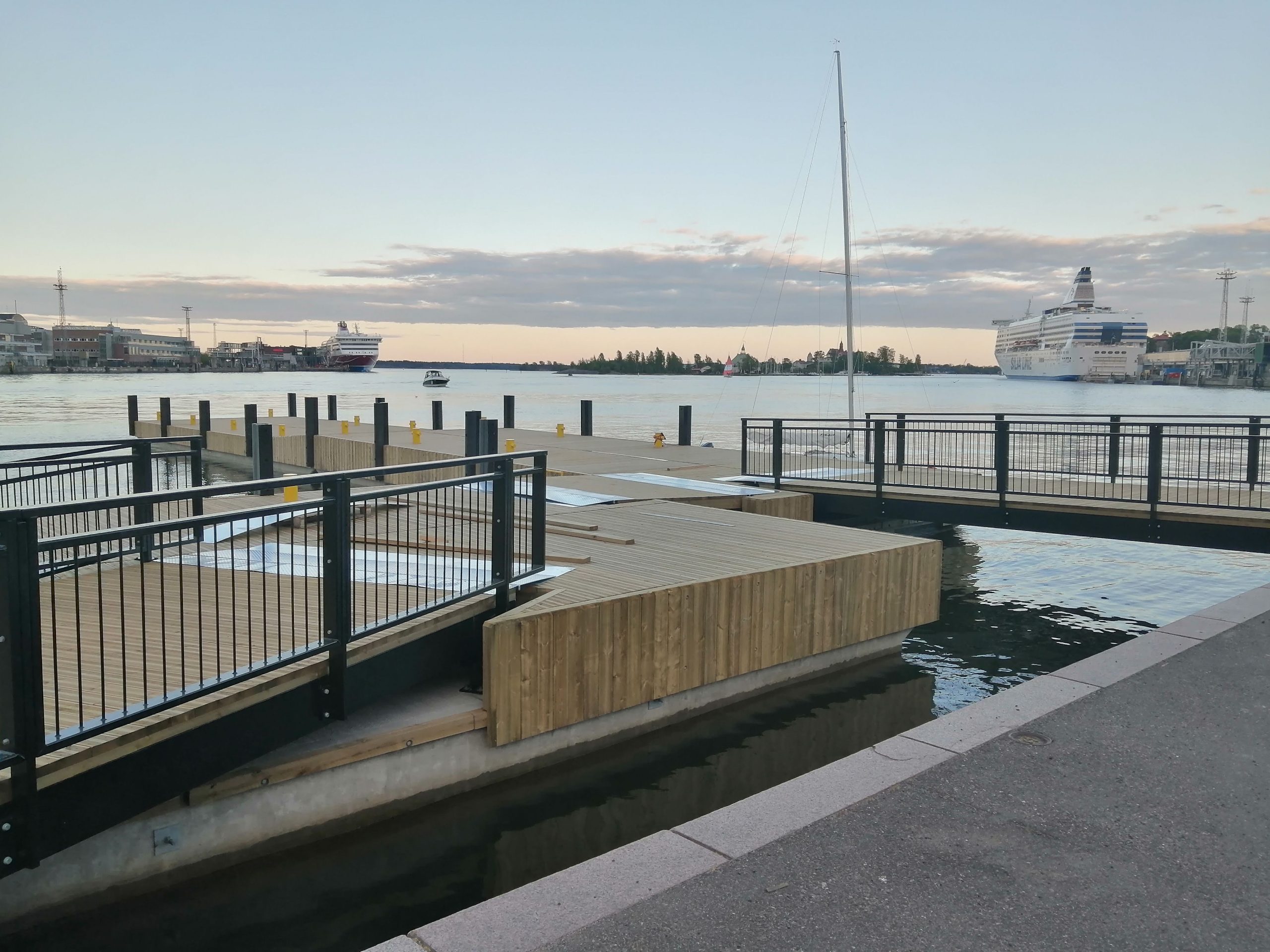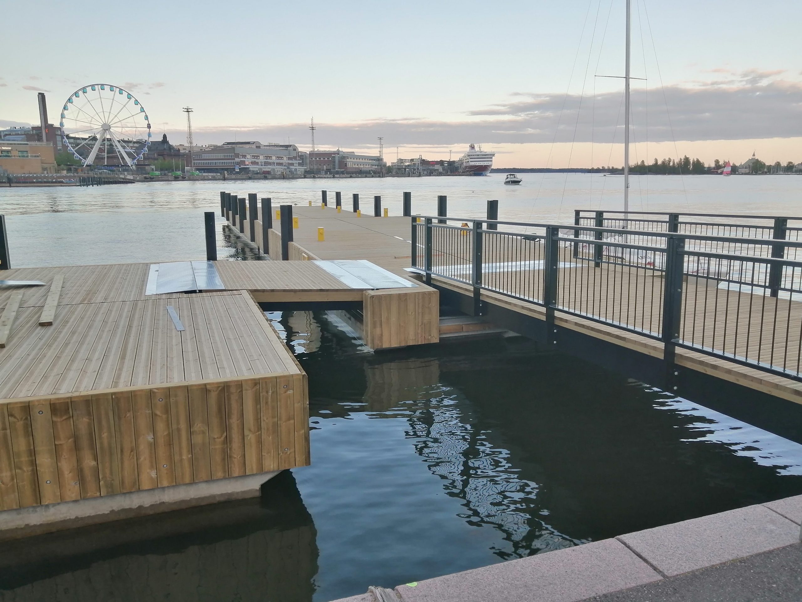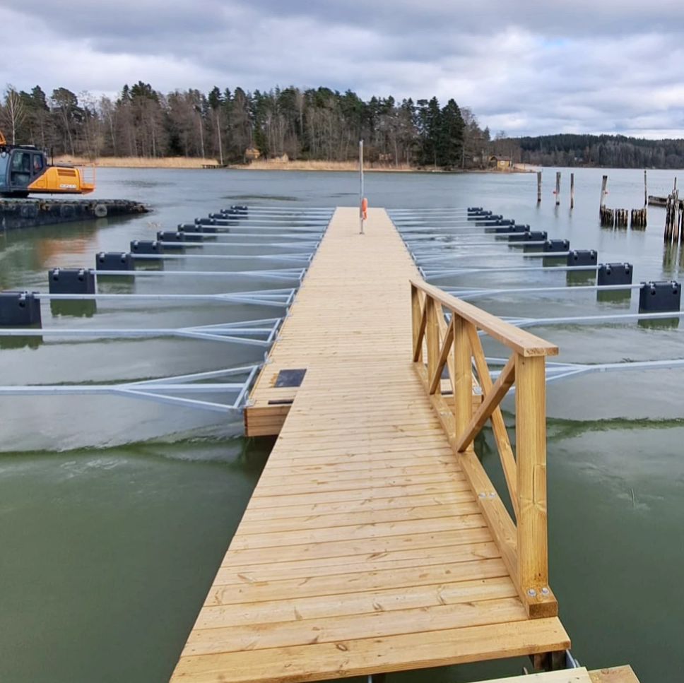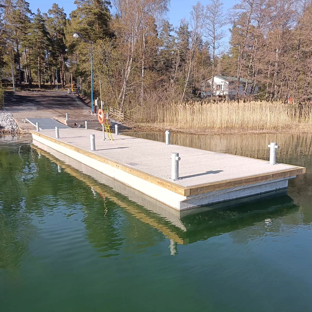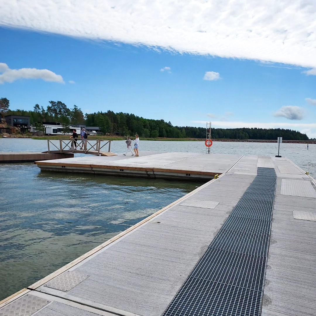 Loviisan asuntomessuille 2022 valmistimme ja asensimme kelluvan kadun kelluvien talojen tarpeisiin. Katu tehtiin kaarevaksi ja ambulanssin kestäväksi. Kadun päässä on ambulanssin kääntöpaikka. Kadun keskellä on tekniikkakouru, johon voidaan sijoittaa talojen vaatimat tekniikkaputket.